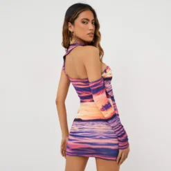 EGO High Neck Cut Out Detail Long Sleeve Side Split Mini Bodycon Dress In Multi Flame Print