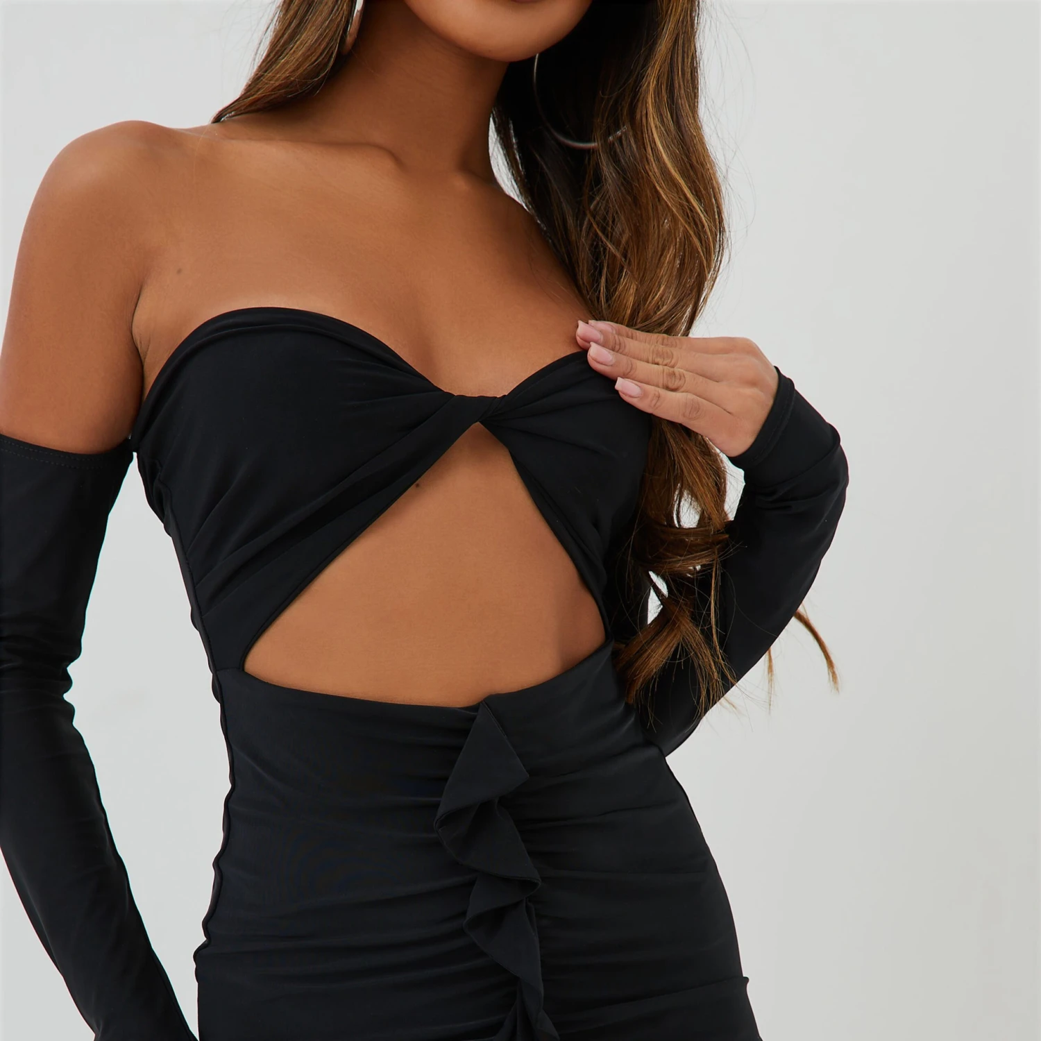 EGO Bandeau Cut Out Frill Detail Mini Bodycon Dress With Sleeves In Black
