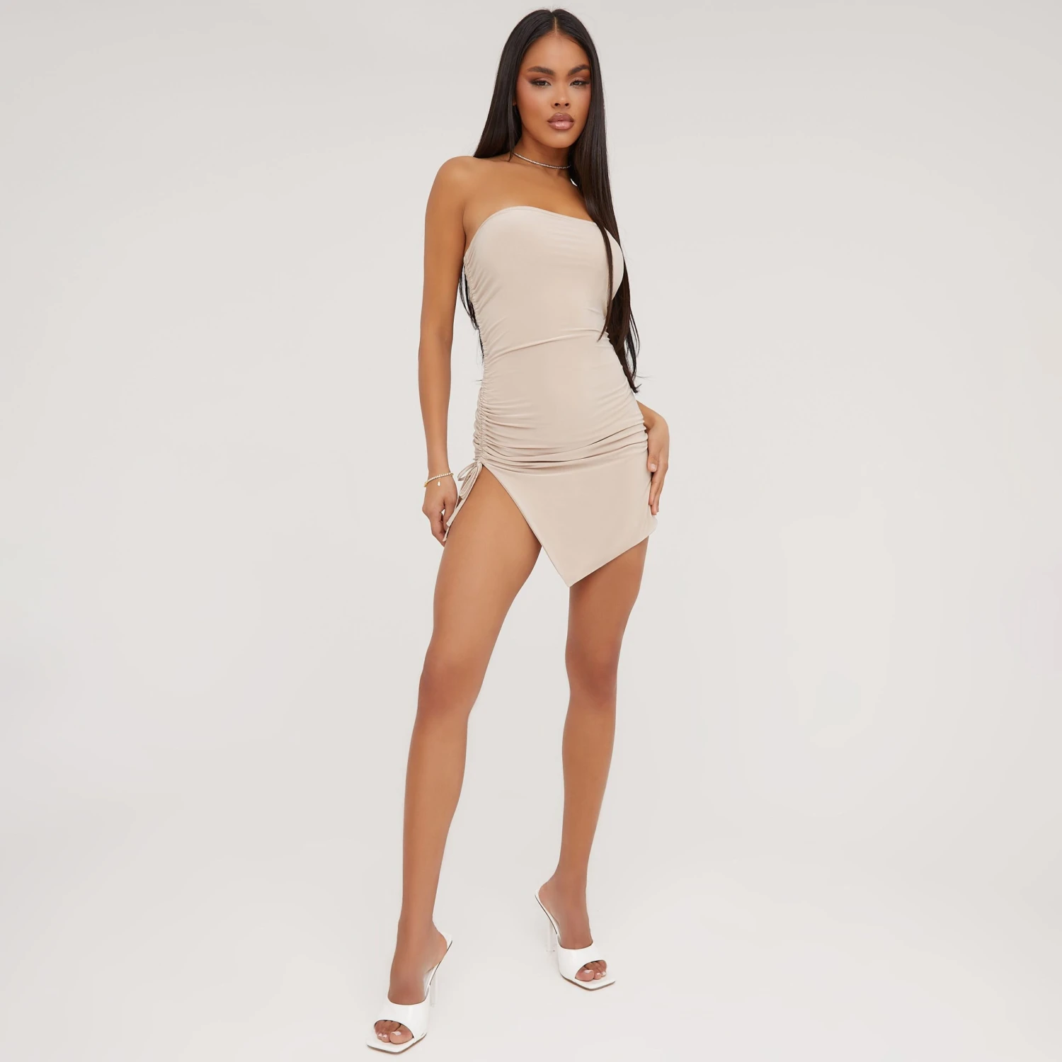 EGO Bandeau Ruched Side Detail Asymmetric Mini Dress In Stone