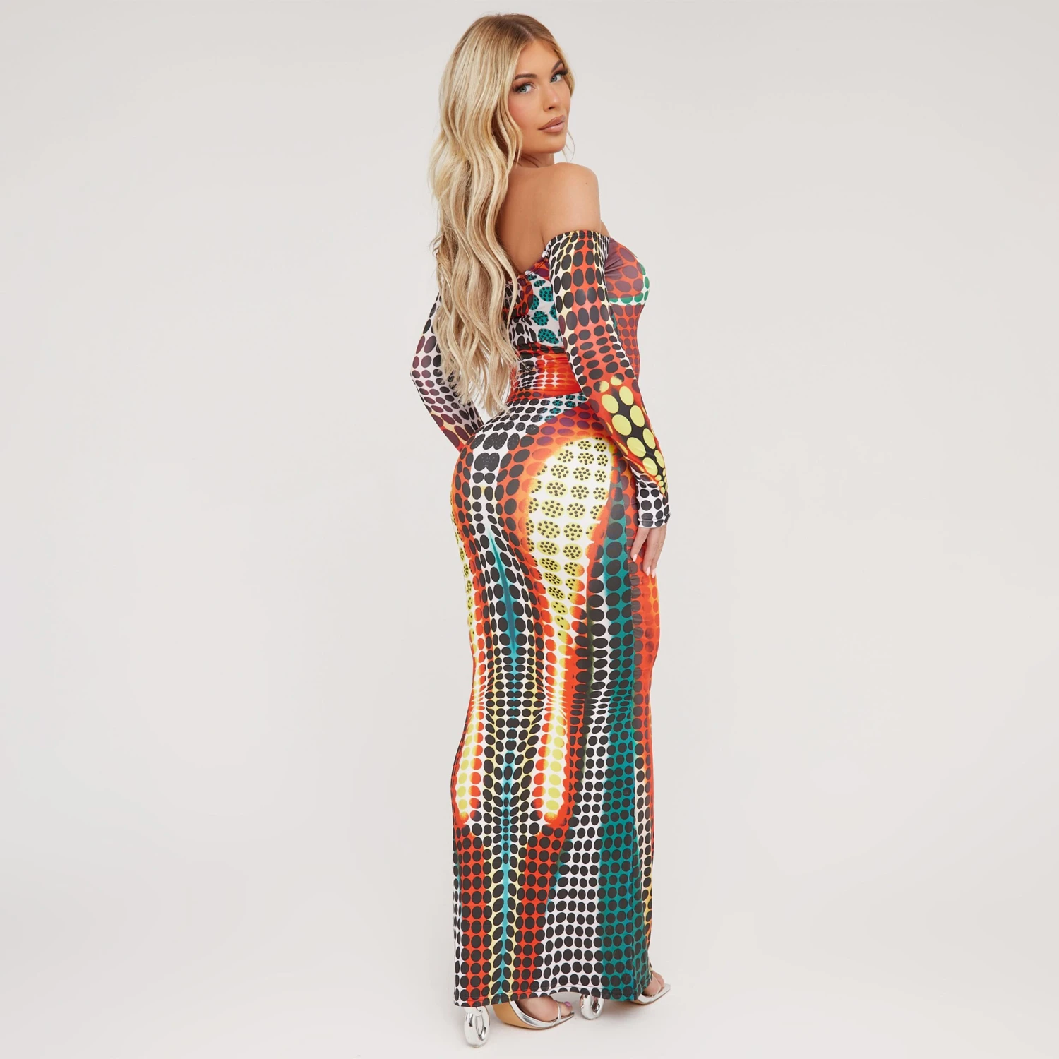 EGO Bardot Long Sleeve Printed Detail Maxi Dress In Muli Slinky