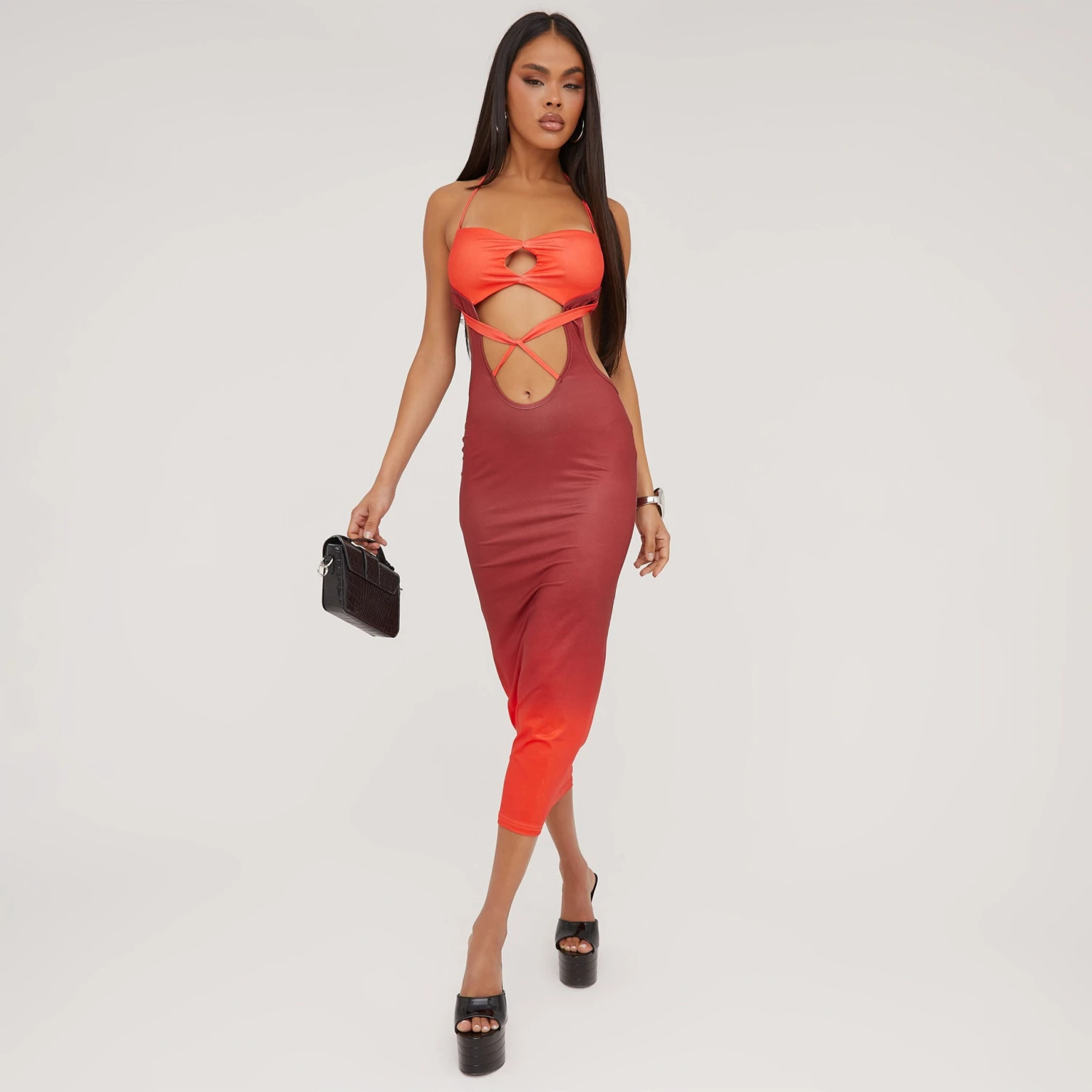 EGO Halterneck Strappy Cut Out Open Back Detail Midaxi Dress In Red Ombre