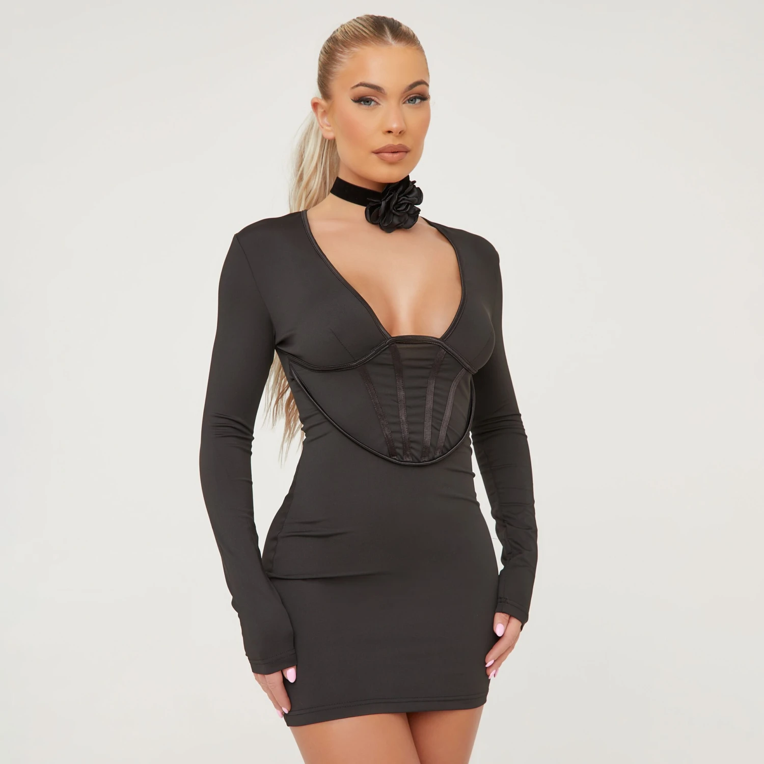 EGO Long Sleeve Corset Detail Mini Bodycon Dress In Black
