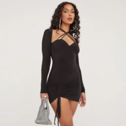 Be the first to review “EGO Long Sleeve Cross Halterneck Strap Ruched Tie Detail Mini Bodycon Dress In Black Slinky” Cancel reply