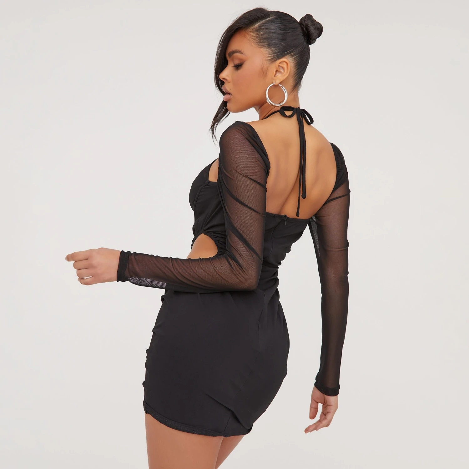 EGO High Neck Long Sleeve Backless Diamante Chain Detail Mini Bodycon Dress In Black Slinky