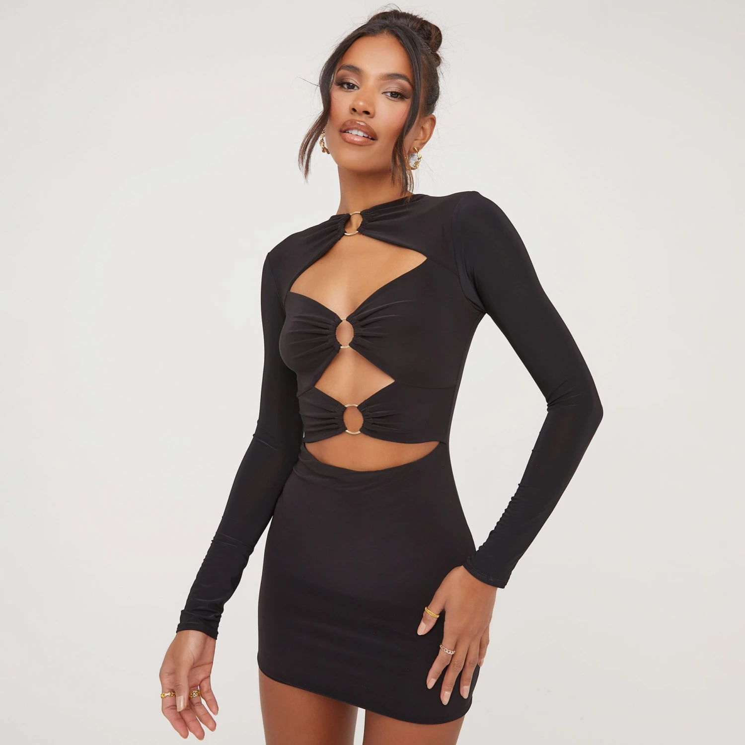 EGO Long Sleeve High Neck Ring Cut Out Detail Mini Bodycon Dress In Black Slinky