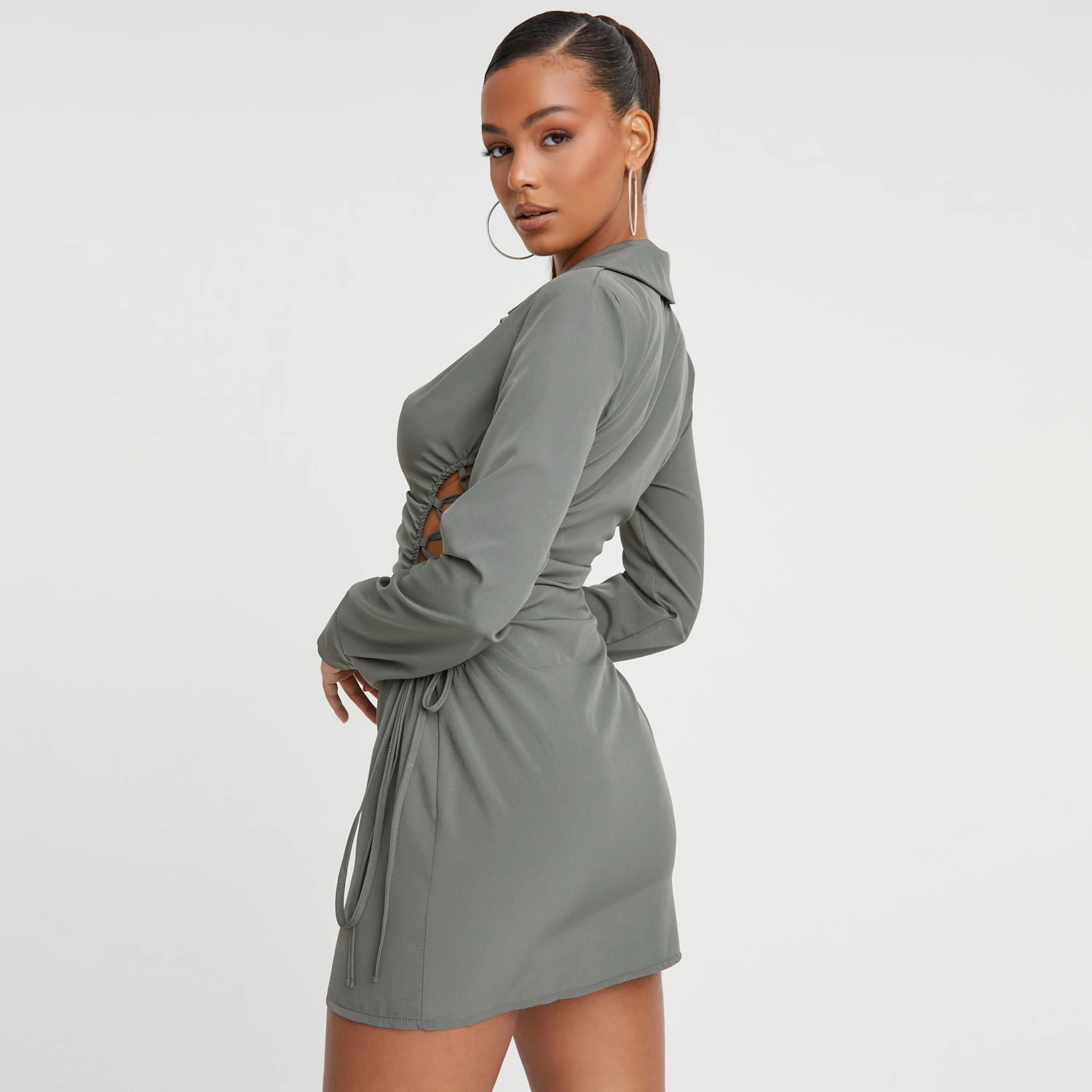 EGO Long Sleeve Lace Up Side Detail Mini Shirt Dress In Khaki