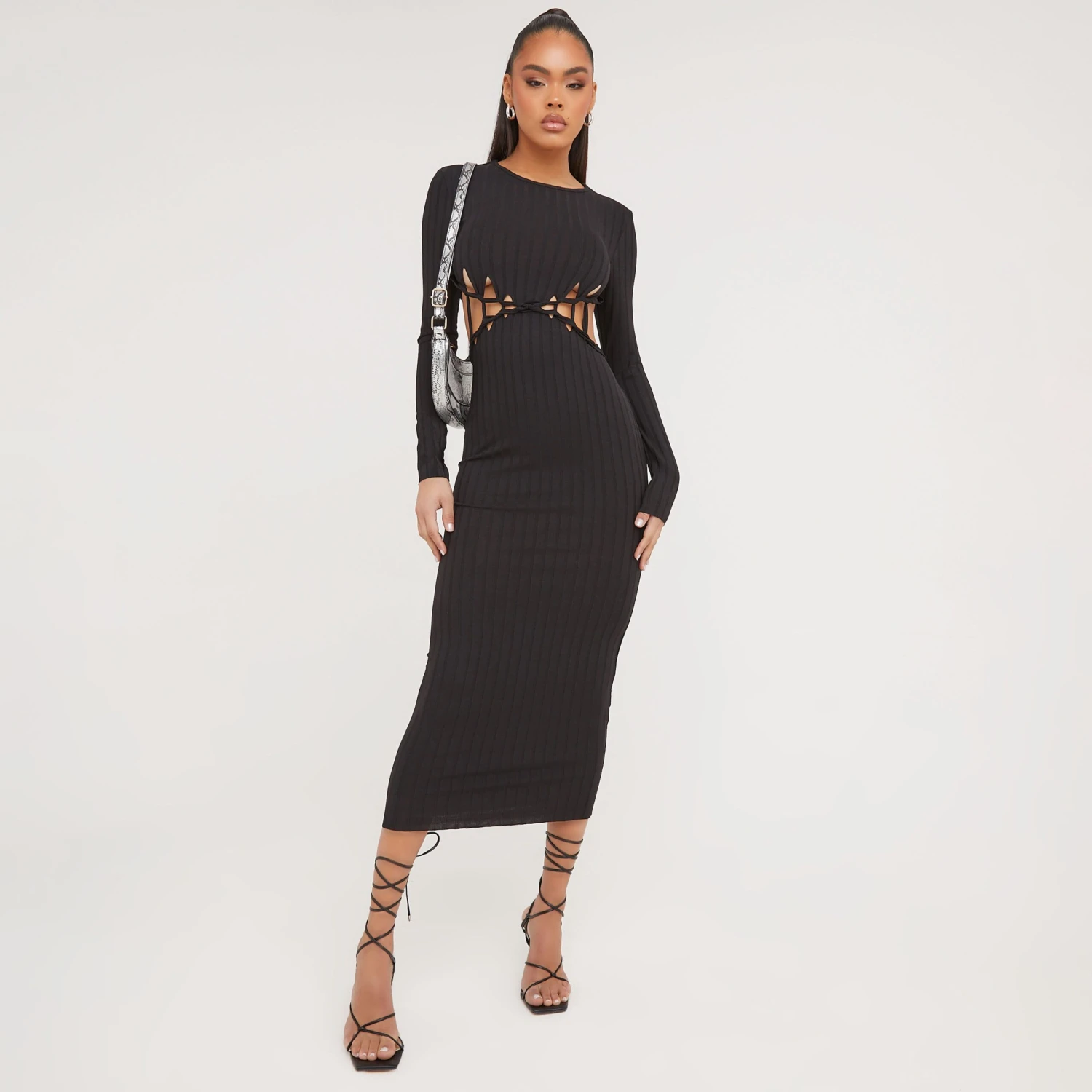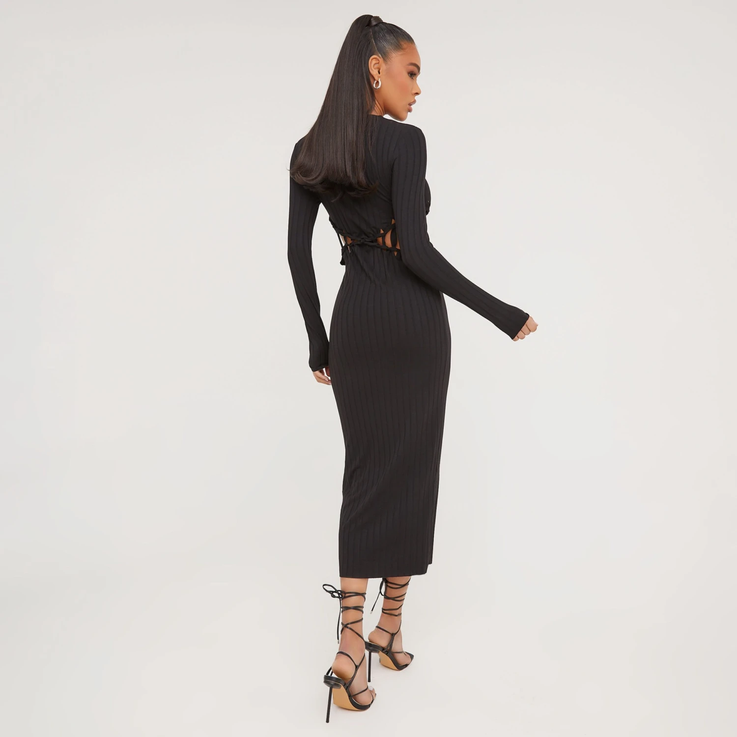 EGO Long Sleeve Ladder Detail Cut Out Maxi Dress In Black Ribbed