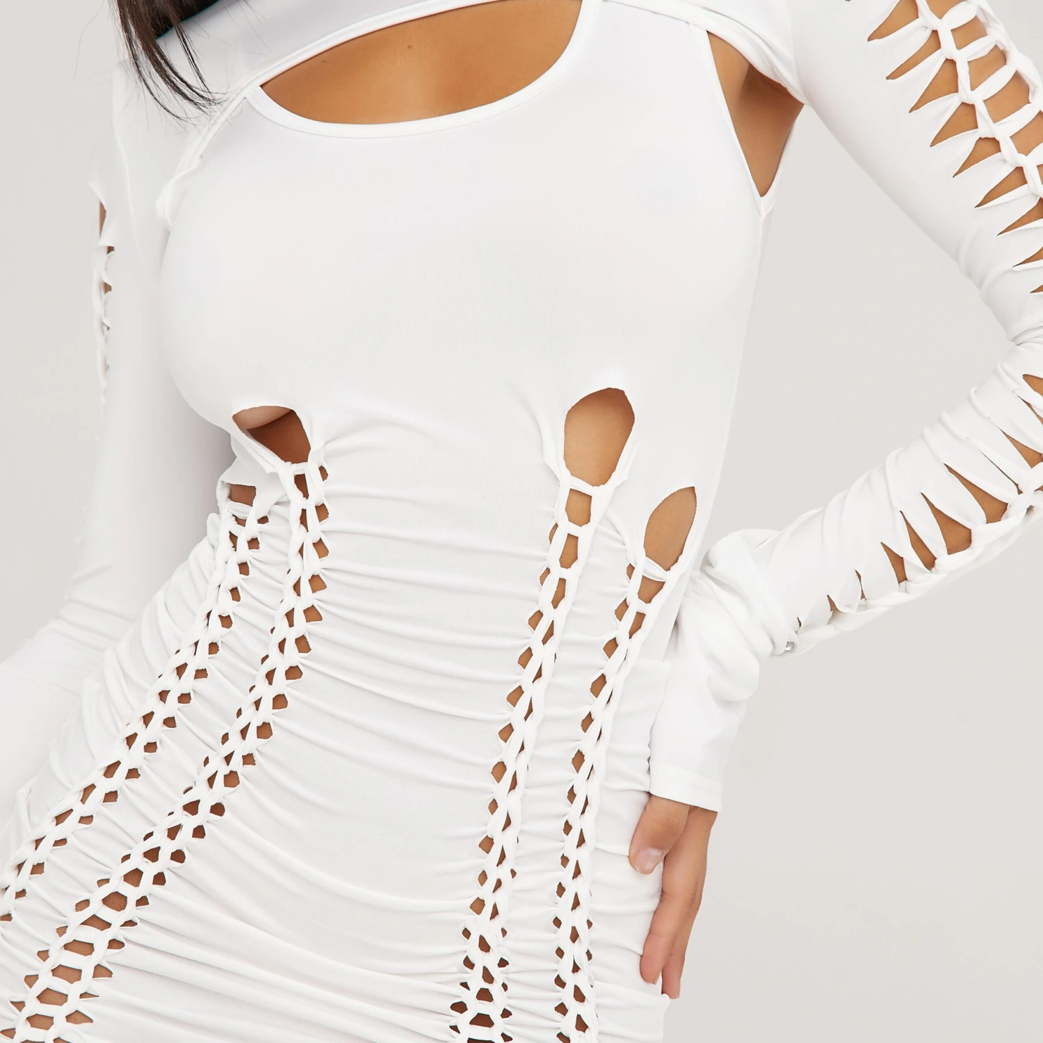 Be the first to review “EGO Long Sleeve Ladder Detail Double Layered Mini Bodycon Dress In White Slinky” Cancel reply