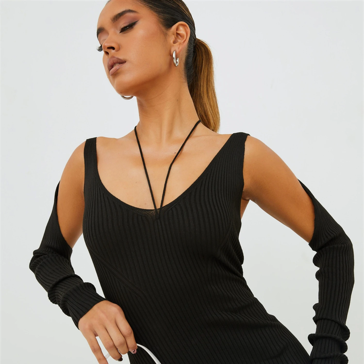 EGO Long Sleeve Strappy Detail Front Split Midi Bodycon Dress In Black Ribbed Knit
