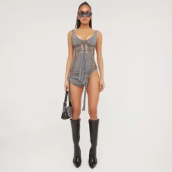 Be the first to review “EGO Low Scoop Neck Extreme Lace Up Detail Tie Back Split Side Mini Dress In Grey” Cancel reply