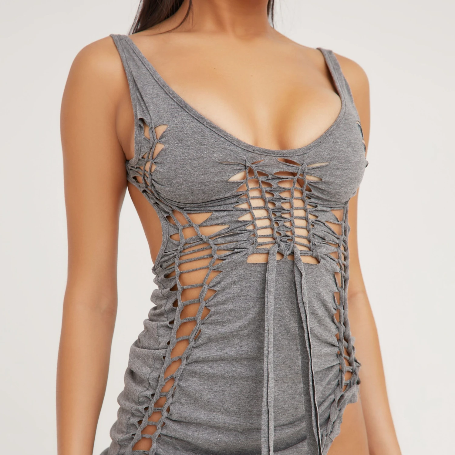Add a little attitude to your weekend attire with this dress doll. Featuring a grey material, extreme ladder detailing, a tie back, a split side and a mini length. Team this with some heels and minimal accessories for a look that’s sure to steal the stares.