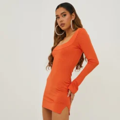 Be the first to review “EGO Low Scoop Neckline Long Split Flared Sleeve Mini Bodycon Dress In Orange Ribbed” Cancel reply