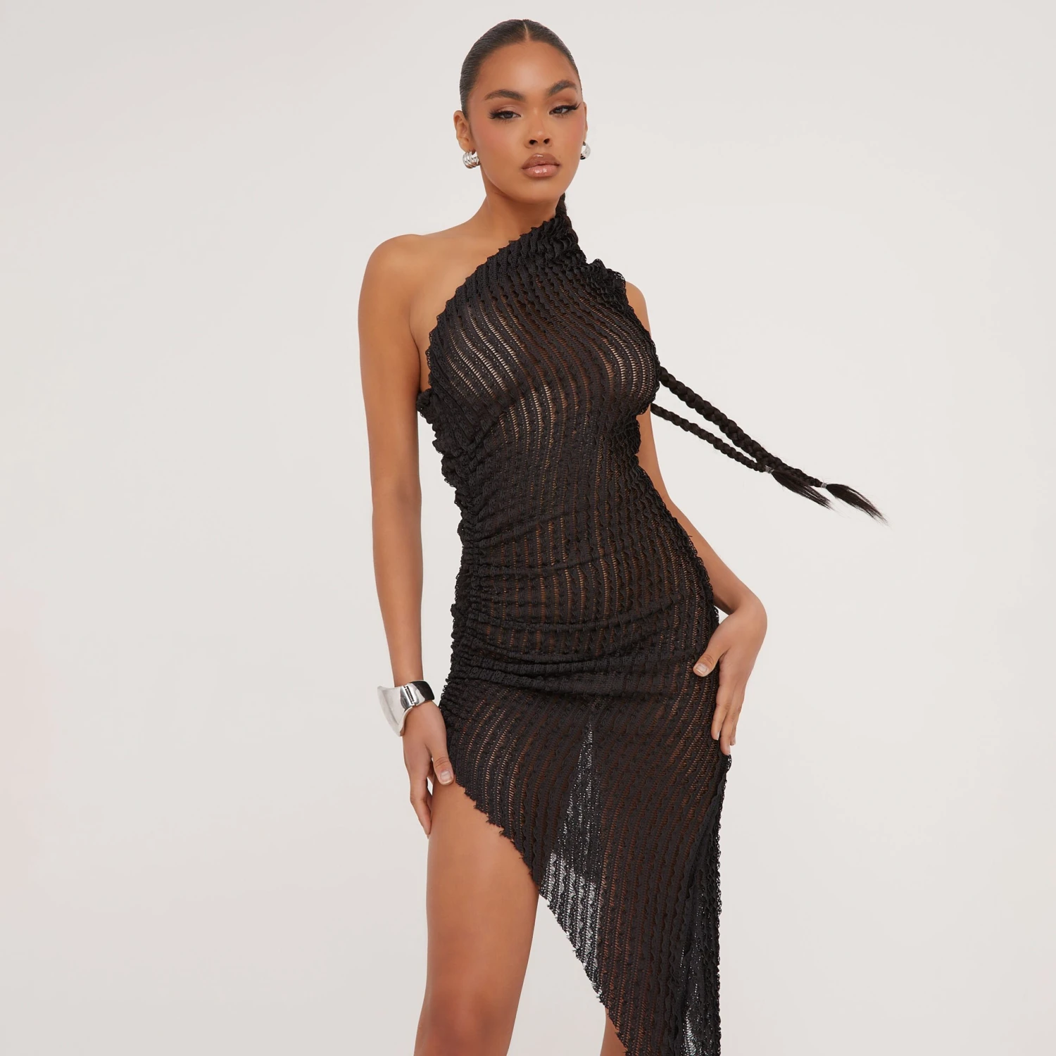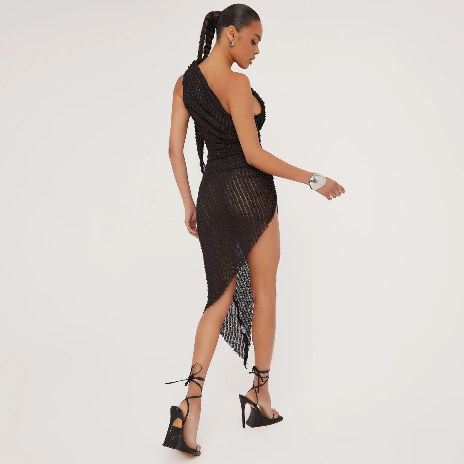 EGO One Shoulder Asymmetric Midi Dress In Black Shirred Knit