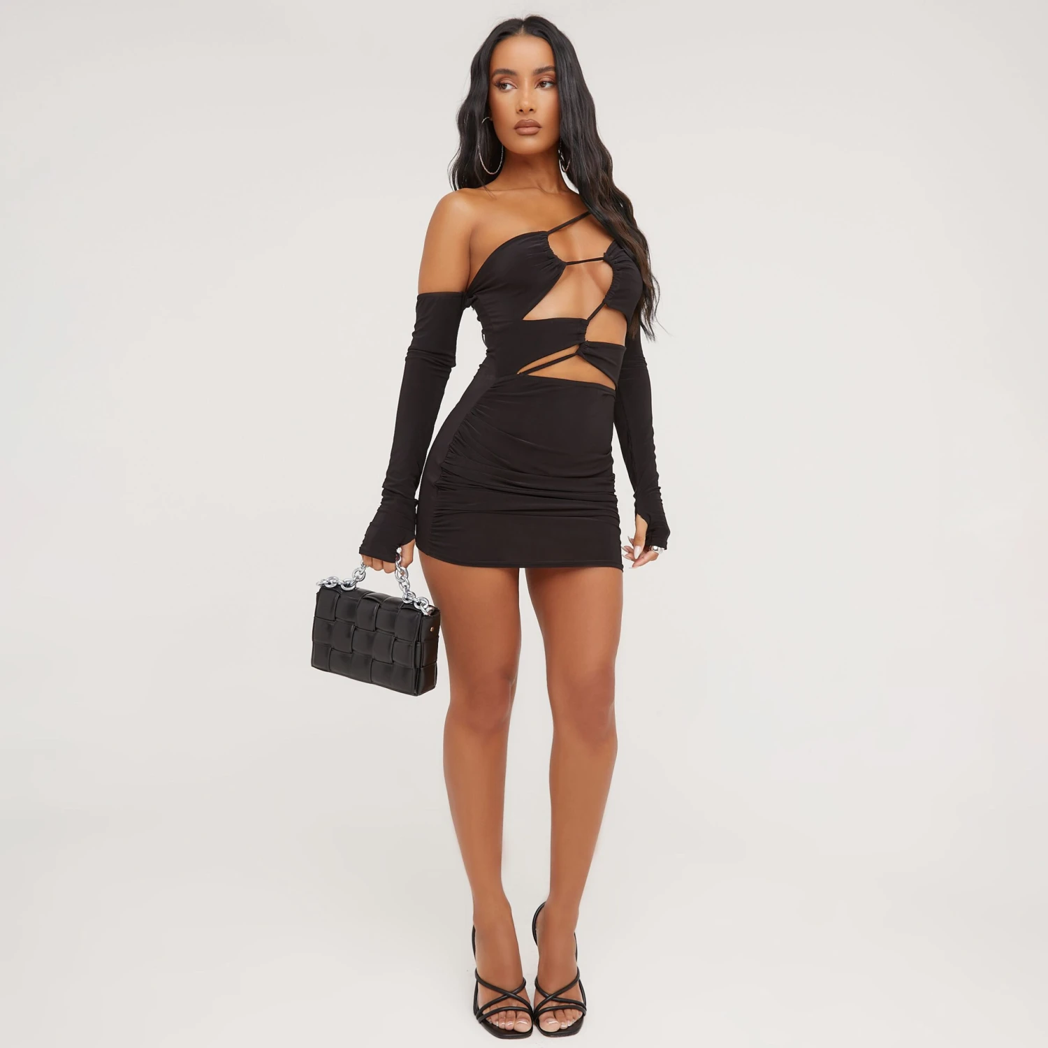 EGO One Shoulder Strappy Cut Out Detail Mini Bodycon Dress With Sleeve In Black Slinky