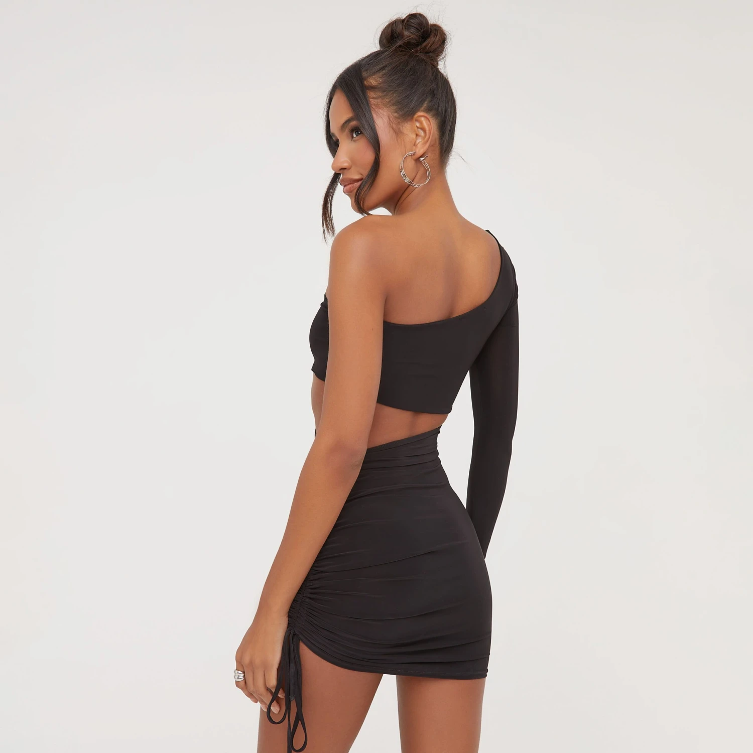 EGO One Sleeve Cut Out Ruched Detail Mini Bodycon Dress In Black Slinky