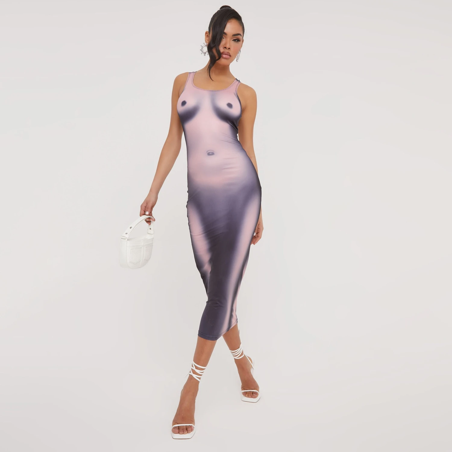 EGO Scooped Neck Body Print Detail Midi Bodycon Dress In Pink