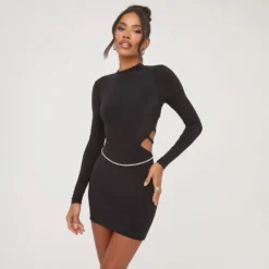 EGO High Neck Long Sleeve Backless Diamante Chain Detail Mini Bodycon Dress In White Slinky