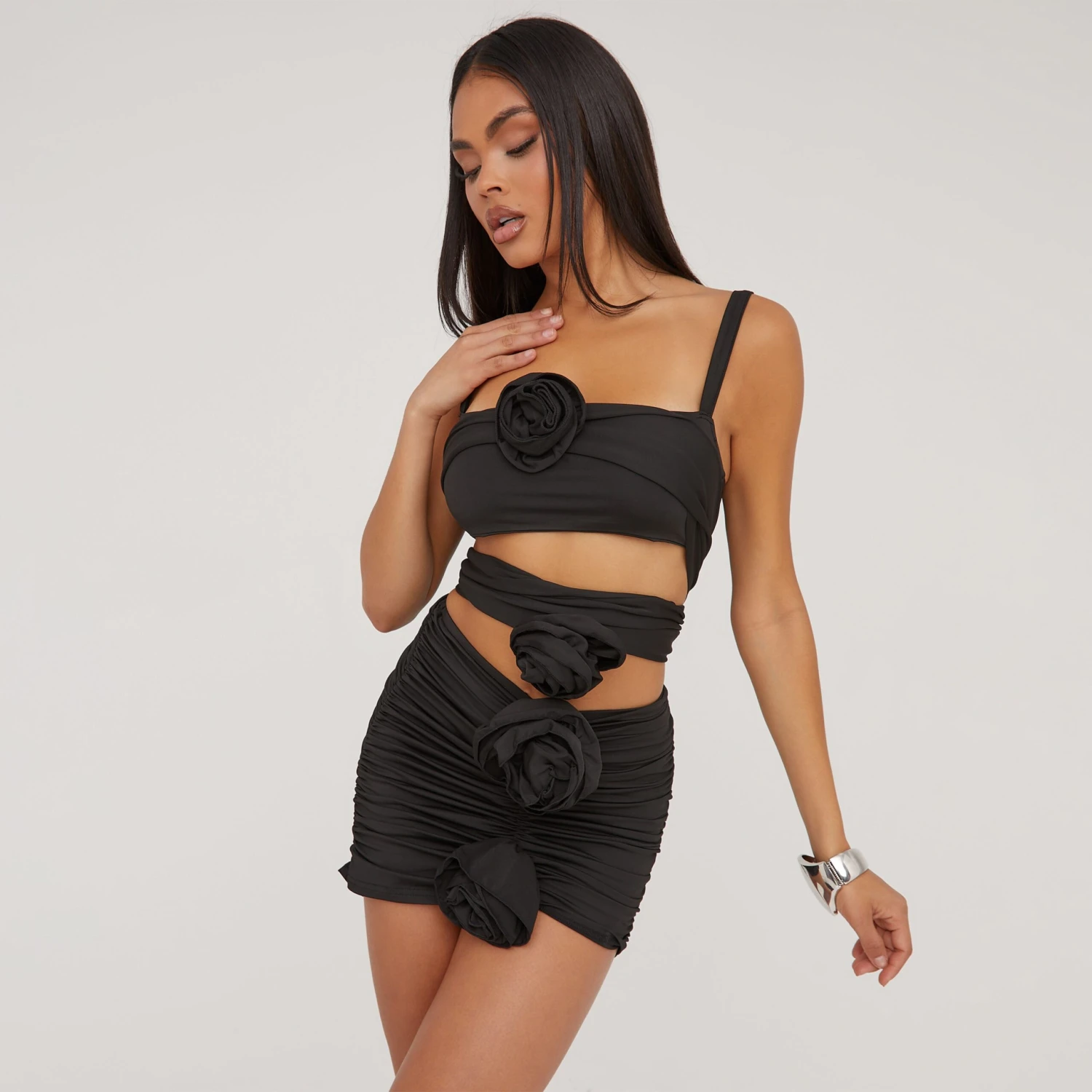 EGO Square Neck Cut Out Ruched Rose Detail Mini Bodycon Dress In Black
