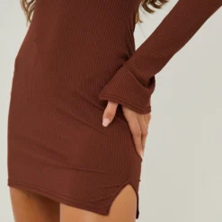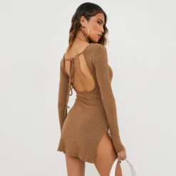 EGO Long Sleeves Tie Back Detail Side Split Mini Dress In Light Brown Ribbed