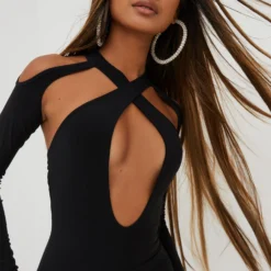 EGO Cold Shoulder Cross Front Detail Mesh Contrast Mini Bodycon Dress In Black Slinky