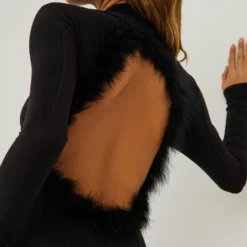 EGO High Neck Long Sleeve Feather Trim Open Back Detail Mini Bodycon Dress In Black Slinky