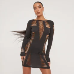 EGO Long Sleeve Extreme Cut Out Ladder Detail Open Back Mini Bodycon Dress In Black Slinky